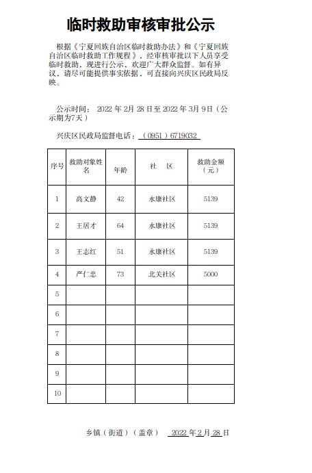 兴庆区玉皇阁北街街道办事处2022年3月临时救助审核审批公示
