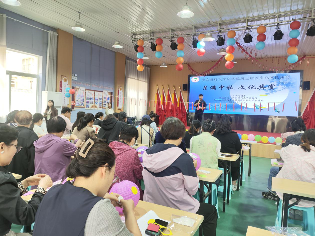 文化街新时代文明实践所组织职工、群众开展了“月满中秋 文化共赏”主题活动,引导居民通过团扇创作、猜灯谜、绘油画板活动,让居民们在欢乐中感受节日的温馨。大家或坐或立,欢声笑语此起彼伏,构成了一幅和谐美好的社区画卷。丰收社区新时代文明实践站举办了“月满中秋 情暖社区”中秋节百家宴活动,以各民族共聚一堂、互尝菜品的方式,倡导居民群众铸牢中华民族共同体意识,营造和谐友爱的邻里关系;游乐社区新时代文明实践站联合宁红养老院开展“暖意迎中秋,传承文化情”文艺演出,表演队的深情演出表达了对祖国的热爱和祝福,歌声悠扬,舞姿曼妙,令人动容;山河湾社区新时代文明实践站联合康颐养老社会组织开展“中秋明月夜 共庆团圆时”活动,邀请辖区群众一同做月饼、话家常、迎中秋,感受中华传统文化的魅力;天成社区新时代文明实践站开展“中秋团员 ‘艾’在身边”中秋节手动DIY活动,用艾草、粗布、麻绳等制作出形似话筒的养生锤,在普及健康养生知识的同时,锻炼了老年人的动手能力,增进了居民之间的感情交流,营造了欢乐祥和的节日氛围。
